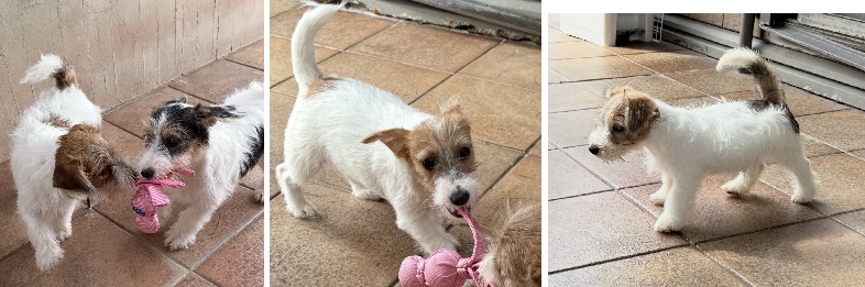 クレア頑張って出産しました。クレアはお腹が大きくなる自分がどうしてなのか理解出来ない様子でお庭に出てもすぐに伏せって動かなくなってしまう事が多々あり。ただお気に入りのピーピーを渡すと止めどなくピーピーの音を鳴らし遊んでいました。性格はジャックとしては温和で精神的に幼い様子で出産は大丈夫かと心配でしたが、案の定、陣痛が始まるとどうして良いかわらず、歩き回りクンクン鳴く始末。強い陣痛が始まってもどう力んで良いか戸惑うばかり。お産が近づくとガリガリと巣作りを始めるのですが、それも殆どなし。クレア、一生懸命頑張ったのですが、破水もして時間も経過していたので、万が一のことを考えて獣医さんの所へ。獣医さんはすぐに帝王切開をと言われましたが、もう少し待ってもらうように病院で様子をみましたが、環境のこともあり強い陣痛が来るのを待って時間が更に経過しクレアに何かあることを避けるため帝王切開に踏み切りました。クレア頑張ったね!